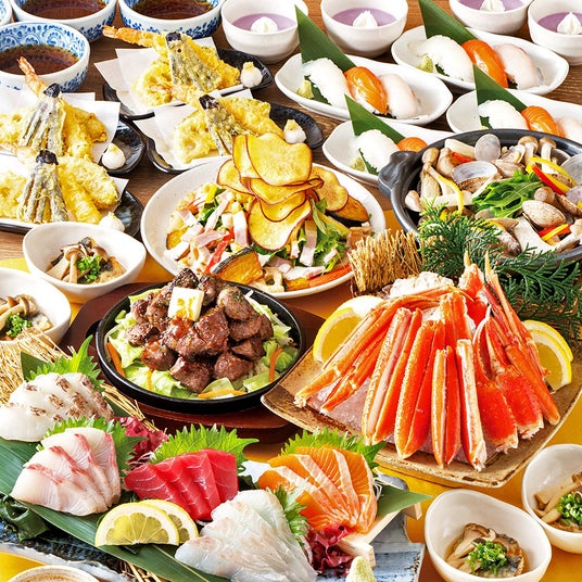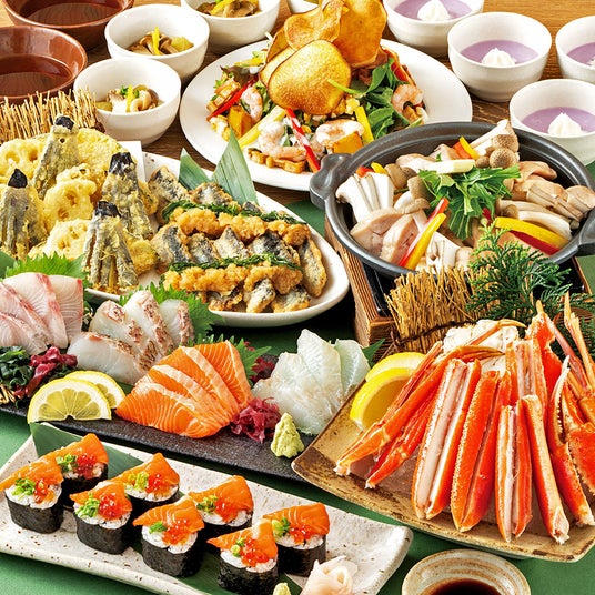 茹で本ズワイガニ、さんまの竜田揚げと秋野菜の天ぷら盛合せ、刺身四種盛合せなど人気メニューが満載のコースです。