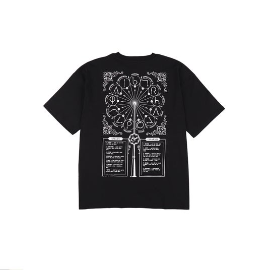 さまざまな呪文の杖の動きを表したイラスト部分が暗闇で鈍く光る、蓄光プリントを施したTシャツです。プリント部分が鈍く青色に光る様子は、映画『ハリー・ポッター』シリーズの作中で魔法を放つシーンを想起させます。ゆったりとしたシルエットは着用するだけでトレンド感のあるコーディネートになり、ユニセックスでの着用も可能なサイズ感です。