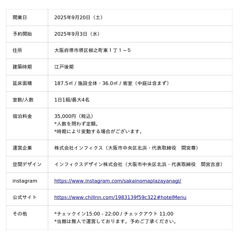 株式会社infix(大阪市中央区北浜、代表取締役:間宮尊)が一棟貸切宿「SAKAINOMA HOTEL 柳」を2025年9月13日に大阪府堺市堺区柳之町に開業します。ご予約は9月3日(水)より公式サイトにて受付開始いたします。
