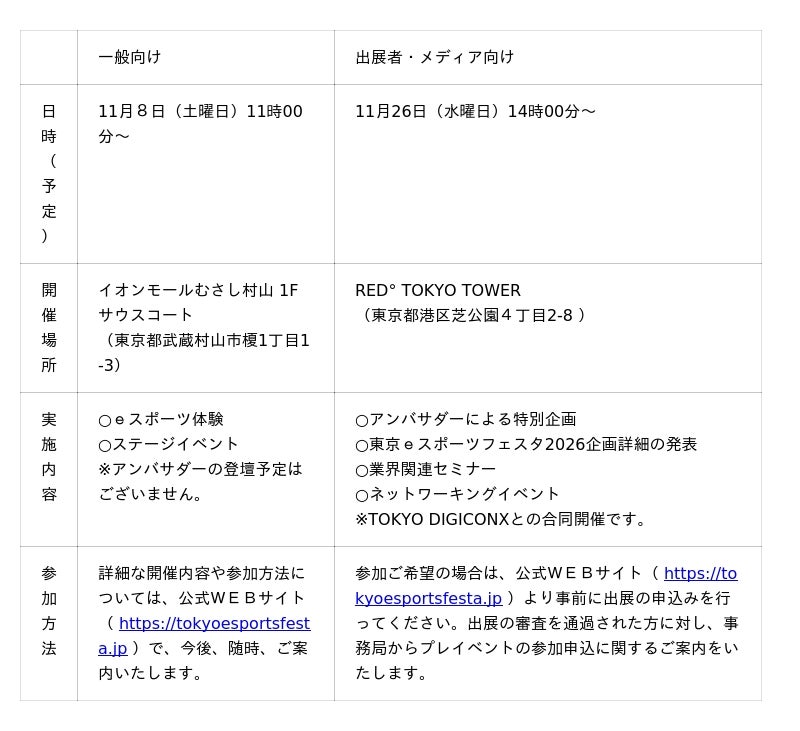 また、フェスタの機運醸成等を目的とし、令和7年11月8日(土曜日)には一般の方を対象にステージイベントやeスポーツ体験会を、同月26日(水曜日)には関連産業展示会の出展者向けにスタンミじゃぱんさんによる特別企画やネットワーキングイベントを開催します。