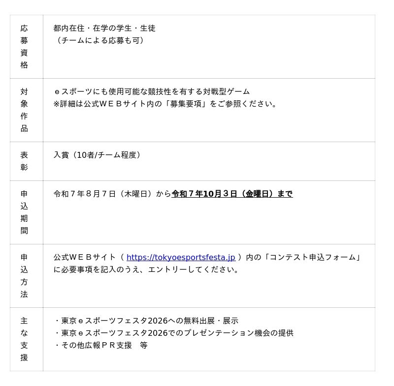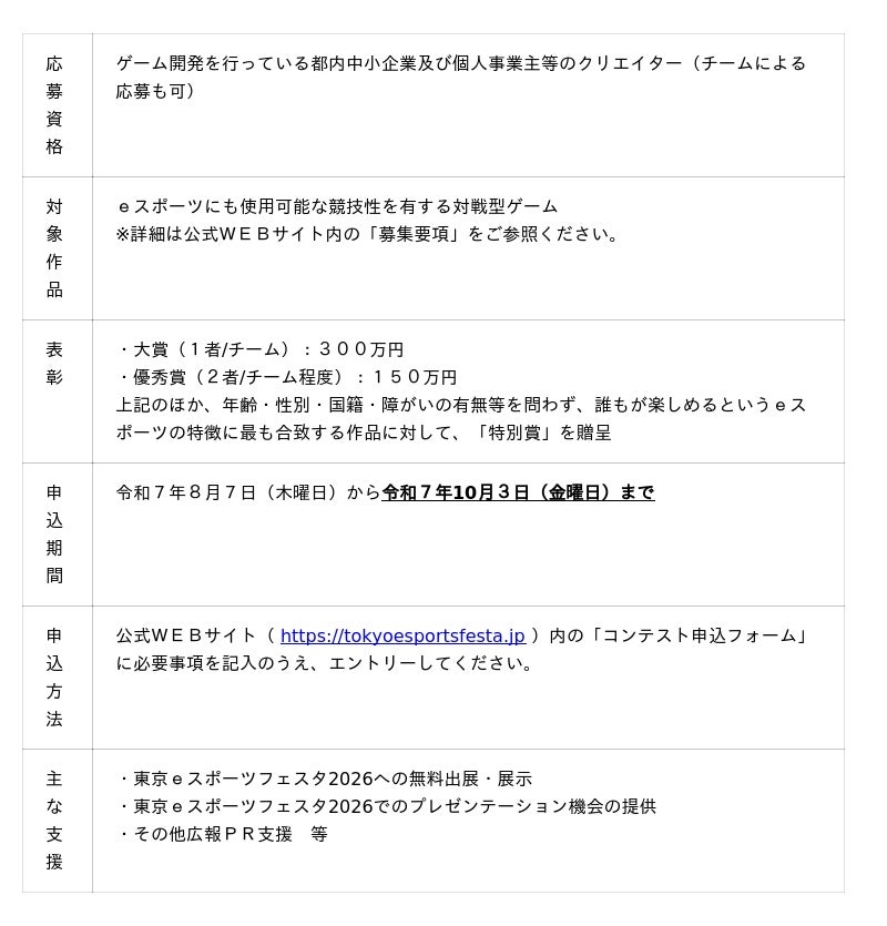 eスポーツに関連する製品・サービスを有する都内中小企業、個人事業主(クリエイター等)、学校、団体等