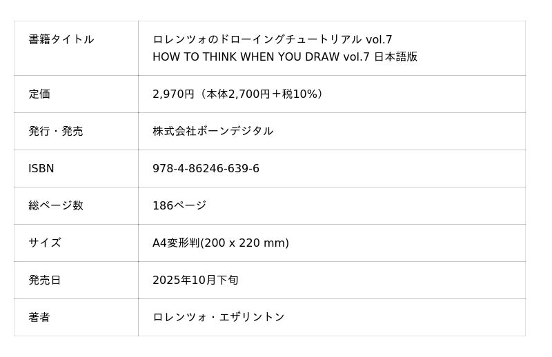 株式会社ボーンデジタル(本社:東京都千代田区、CEO:新 和也、URL:https://www.borndigital.co.jp)は、『ロレンツォのドローイングチュートリアル vol.7』(著:ロレンツォ・エザリントン)を2025年10月下旬に発売いたします。