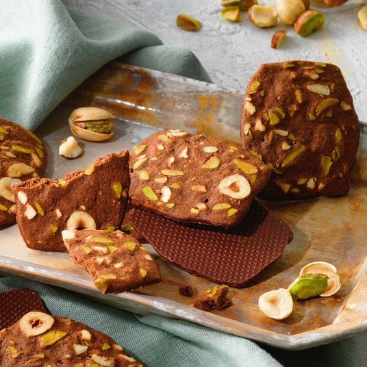 ヘーゼルナッツとピスタチオを入れて、薄く焼き上げたココア生地の片面に、すっきりとした甘さのチョコレートをコーティング。生地にはアクセントに塩と風味付けのコニャックを練り込みました。香り高いヘーゼルナッツと旨み豊かなピスタチオを組み合わせることで、風味と食感に奥行きを持たせた、さっくりとした軽い食感の薄焼きサブレです。