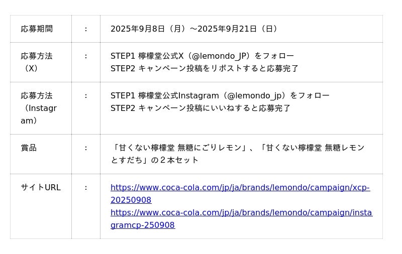 今回新登場の「甘くない檸檬堂 無糖にごりレモン」を手軽にお試しいただけるように、9月8日(月)よりX、InstagramにてSNSキャンペーンを開催します。期間中、「檸檬堂」公式Xアカウントをフォロー&キャンペーン投稿をリポスト、または「檸檬堂」公式Instagramをフォロー&キャンペーン投稿にいいね、していただいた方の中からそれぞれ抽選で100名様に新登場の「甘くない檸檬堂 無糖にごりレモン」と「甘くない檸檬堂 無糖レモンとすだち」の2本セットを、プレゼントします。