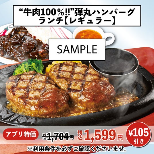 「"牛肉100%!!"弾丸ハンバーグ」全品お得になるので、定番のレギュラーやコンビメニュー、お得なランチも特別価格に!さらに、おこさまメニューも割引になります。ぜひアプリをダウンロードして、チェックしてみてください。<弾丸ハンバーグクーポン・一例>