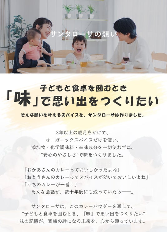 サンタローサの「わが家のやさしい有機カレー粉」は、子どもが大人になったときに「うちのカレーはこれだよね」と思い出す、家族の記憶を育むことを目指して誕生しました。
