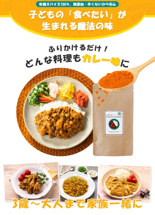 さらに、お好みでカイエンペッパーやガーリックパウダーを加えることで、大人好みのアレンジも自在。子どもから大人まで同じ食卓で楽しめる、新しい"家庭の定番カレー粉"です。
