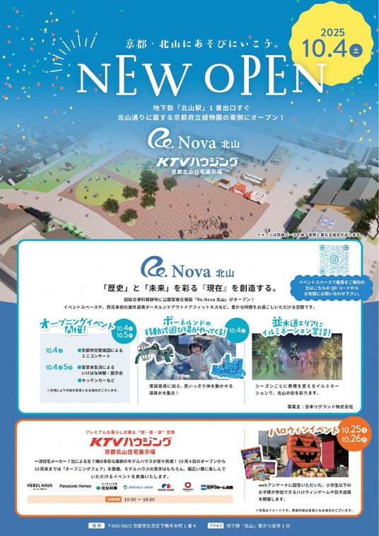 京都府では、旧総合資料館跡地の本格活用までの間、民間事業者が整備運営し、民間の創意工夫やノウハウを最大限に活かした、公園型複合施設「Re.Nova北山(リ.ノヴァキタヤマ)」が10月4日にオープンします。住宅展示場をはじめ多彩なイベントなど開催できる広場など、人々が集い交流する場として北山の魅力向上につなげます。