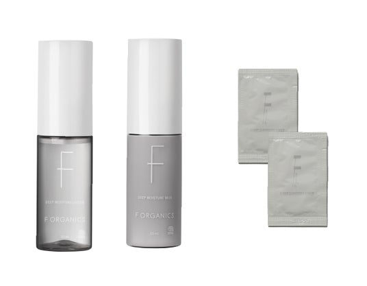 10,000円(税込)以上お買い上げのお客様に、F ORGANICSのディープモイスチャーローション30mL、ディープモイスチャーミルク25mL、クレンジングリキッド サンプル2包をプレゼントいたします。