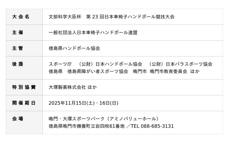 一般社団法人日本車椅子ハンドボール連盟(会長:半田忠史)は、文部科学大臣杯第 23 回日本車椅子ハンドボール競技大会を2025年11月15日(土)・16日(日)に徳島県鳴門市「鳴門・大塚スポーツパーク(アミノバリューホール)」で開催することを決定し、参加チームの登録を開始しましたのでお知らせいたします。
