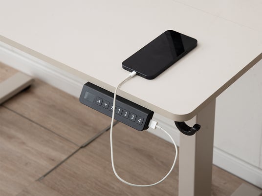 さらに、ヘッドフォンやバッグを掛けられるフックや、卓上でこぼれる危険性がある飲み物を入れて置けるドリンクホルダーが付属しております。ドリンクホルダーは使用しない時は天板下に収納できるため、すっきりとした作業環境を維持できます。また、昇降操作パネルの横にはUSBポートを備えており、スマートフォンなどをデスク上で充電しながら作業できます。