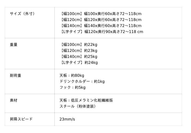 サイズは幅100cm/120cm/140cmに加え、作業の幅が広がるL字タイプを展開。