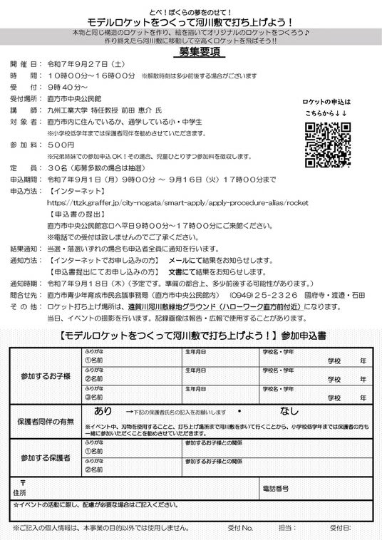 「とべ!ぼくらの夢をのせて!モデルロケットをつくって河川敷で打ち上げよう!」を開催します。