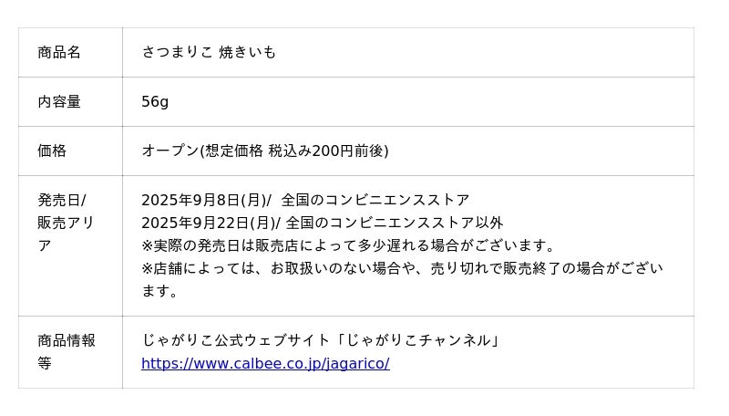 カルビー株式会社(本社:東京都千代田区、代表取締役社長兼CEO:江原 信)は、独自の製法で"はじめカリッとあとからサクサク"の心地よい食感が楽しめる「じゃがりこ」の姉妹品として、さつまいもの甘さが楽しめる『さつまりこ 焼きいも』を2025年9月8日(月)から全国のコンビニエンスストア先行で季節限定発売します。コンビニエンスストア以外の店舗では、同年9月22日(月)から季節限定発売します(同年10月下旬終売予定)。