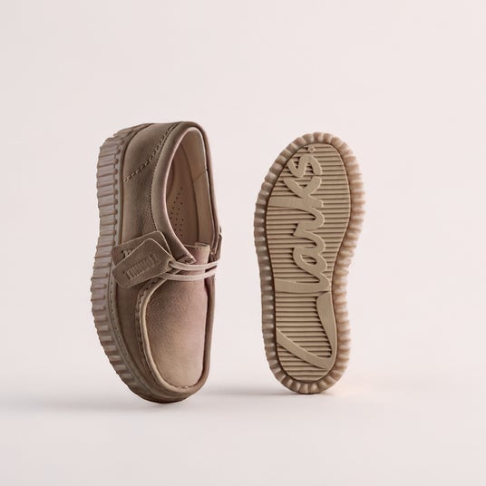 クラークスを代表するアイコン「ワラビー」からインスパイアされた「Torhill Lo」を、女性向けにアップデート。ワラビーのアッパーに、90 年代に誕生した厚底ソール「BigGripper(ビッググリッパー)」を融合し、クラシックな魅力にトレンド感をプラスしました。軽量ながら耐久性に優れたアウトソールは快適な履き心地を提供し、靴裏の大きなClarksロゴも当時のデザインを継承しています。