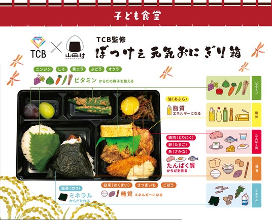 おにぎりを中心に各種おかずやフルーツを添え、TCBが医学的観点から栄養バランスを考慮し監修したこの日だけの特別弁当「TCB監修 ぼっけぇ元気おにぎり箱」を子どもたちに無料で提供いたします。