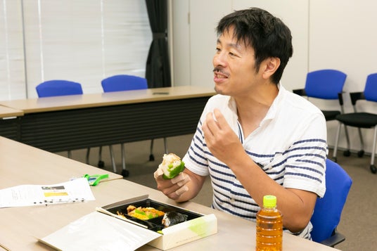 メニュー開発会議でおにぎりのこだわりを語る山田社長