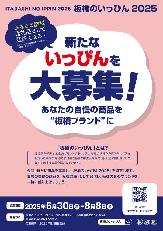 板橋区を代表する食のブランドであり、区内商業の活性化を目的として区が認定する「板橋のいっぴん」。前回の令和4年のリニューアル認定に続き、さらに多くの方々に「板橋のいっぴん」への関心を持ち続けていただけるよう、新たに「板橋のいっぴん2025」の認定を行う予定です。今回、令和7年6月30日(月)~8月8日(金)までの募集期間を経て、区内の各店舗一押しの商品がなんと96品も応募されました。