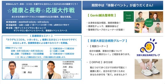 Genki鍼灸整骨院グループ(本社:京都府京都市、代表:吉村直心)は、2025年9月10日(水)から9月16日(火)まで京都大丸で開催される「健康と長寿☆応援大作戦」に特別参加いたします。本催事では、単なる健康イベントに留まらず、一日を通して「施術体験」「柔軟性チェック」「健康体操」など多彩なプログラムを体験いただけます。また、代表・吉村直心による特別セミナーも開催し、学びと体験の両面から"健康で痛みのない身体づくり"を応援します。