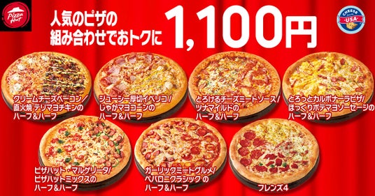 ※対象ピザ:「クリームチーズベーコン/直火焼 テリマヨチキンのハーフ&ハーフ」「ジューシー厚切イベリコ/じゃがマヨコーンのハーフ&ハーフ」「とろけるチーズミートソース/ツナマイルドのハーフ&ハーフ」「とろっとカルボナーラピザ/ほっくりポテマヨソーセージのハーフ&ハーフ」「ピザハット・マルゲリータ/ピザハットミックスのハーフ&ハーフ」「ガーリックミートグルメ/ペパロニクラシックのハーフ&ハーフ」「フレンズ4」