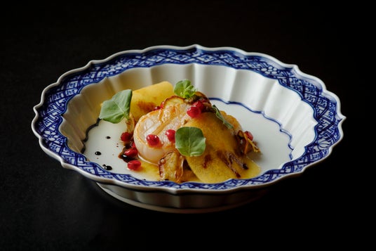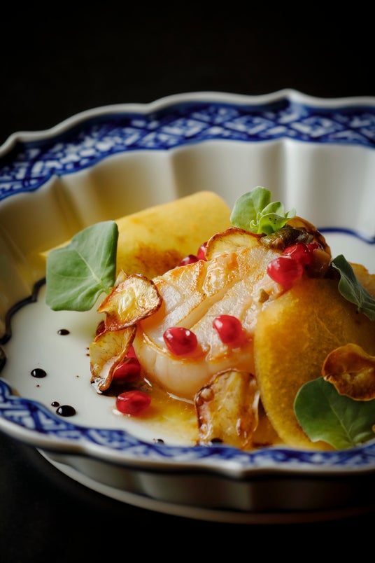 肉厚でふっくらとした大粒のホタテ貝は、滋味豊かな丹波栗を贅沢に用い、そのほのかな甘みを生かした秋らしいソースで上品に仕立てました。やわらかな甘みと深い旨味が織りなす味わいに、旬を迎えた柿やむかごを添え、秋の恵みを一皿の上に優美に表現しています。海と山の幸が響き合う、実りの季節ならではの一皿です。