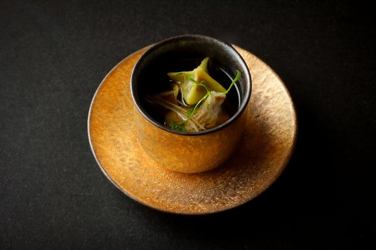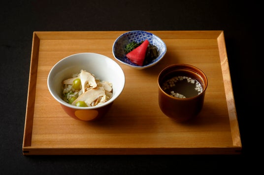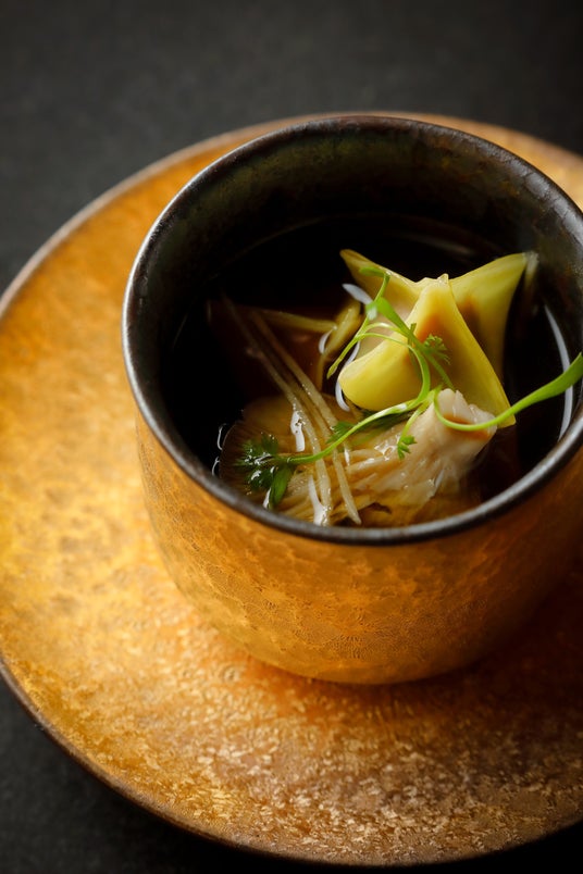 京都・丹後が誇る、甘みと粘りに優れた新米"コシヒカリ"を用いた贅沢な炊き込みごはん。丹念に引いた地鶏の出汁でふっくらと炊き上げることで、お米本来の優しい甘みが一層引き立ち、滋味深い味わいへと昇華します。具材には、秋の味覚の象徴ともいえる松茸を惜しみなく使用。蒸気とともに立ちのぼる馥郁たる香りが五感を包み込み、目の前で炊き上がる瞬間から、まさに旬の醍醐味を存分にお楽しみいただけます。秋のコースを締めくくるにふさわしい、究極の一品です。