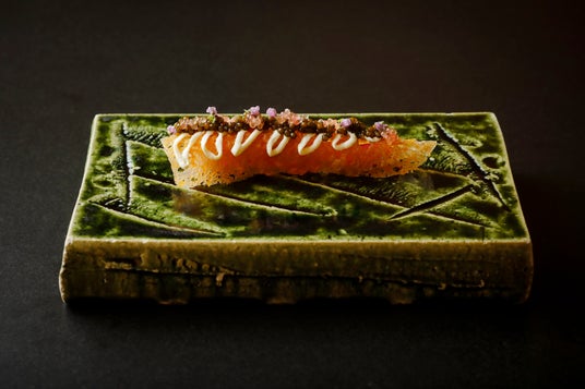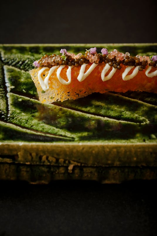 旨味豊かな"足赤海老"を、京都産そば粉を用いた繊細なダンテル仕立てに。弾力ある海老と軽やかな食感のダンテルが織りなす、趣ある一皿です。サワークリームに爽やかなレモンクーリを重ね、キャビアがほどよい塩味と異なる食感を添え、素材の魅力を一層引き立てます。秋の訪れを優美に表現したアミューズとしてお楽しみください。