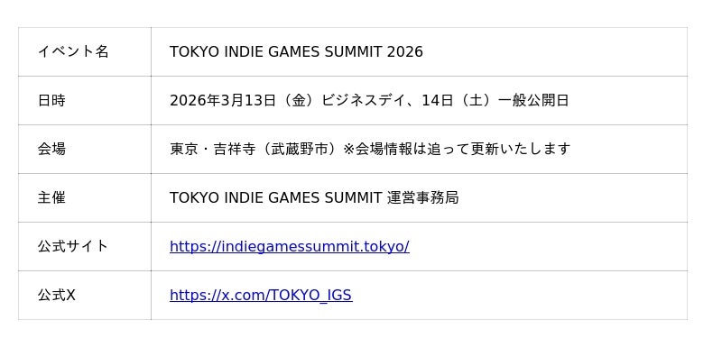 株式会社Phoenixx(フィーニックス)(東京都武蔵野市、代表取締役社長:坂本和則)は、2026年3月13日(金)・14日(土)に、第4回目となるインディーゲームの祭典『TOKYO INDIE GAMES SUMMIT 2026』の開催を決定しました。また開催にともない、本日9月5日(金)よりクリエイターの出展募集を開始します。