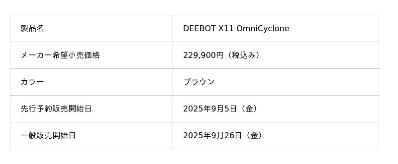 研究開発から製造、販売までを一貫して行い、家庭用ロボットをグローバルに展開する総合メーカー、エコバックスジャパン株式会社(本社:東京都千代田区、社長:梅田永智)は、2025年9月26日(金)から最新技術を搭載した新製品「DEEBOT X11 OmniCyclone」を発売いたします。本製品は、エコバックスの最新フラッグシップモデルとして、これまでにない清掃力と利便性を提供します。先行予約販売は9月5日(金)より開始します。