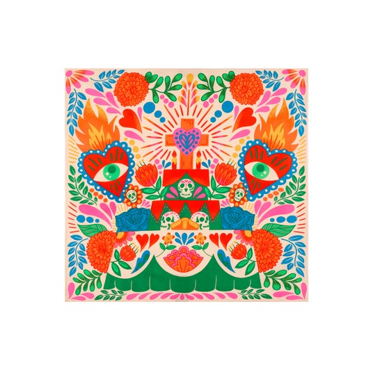 風呂敷をヒントに生まれた、何度も繰り返し使える数量限定のギフトラッピング用商品です。メキシコのお祭りをイメージした鮮やかなデザインを手がけたのは、メキシコ生まれで現在はアメリカ・カリフォルニア州を拠点に活動するグラフィックデザイナー兼イラストレーターのBlanca Molina。メキシコの伝統や図像に触発された作品です。