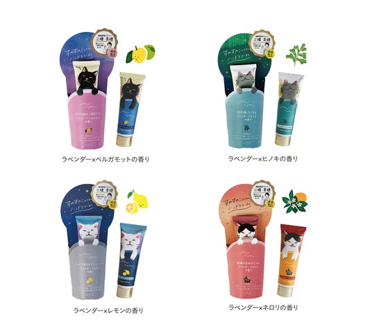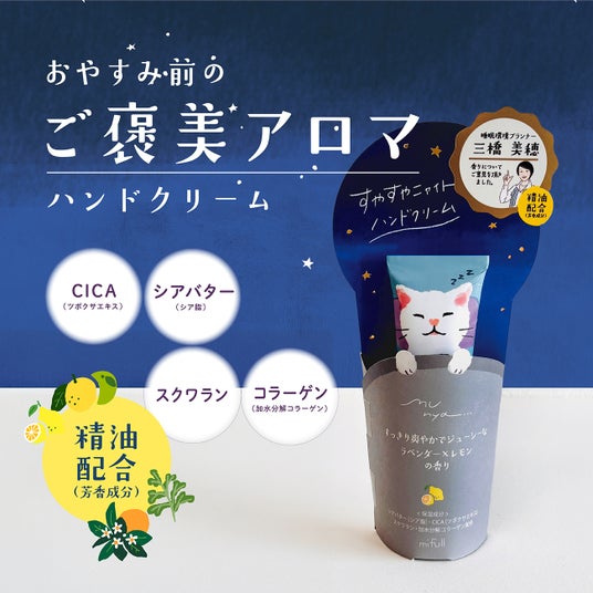 「munya」シリーズには、精油の香りを贅沢にブレンドした7つのアイテムが揃いました。すやすやニャイト ハンドクリーム(全4種)