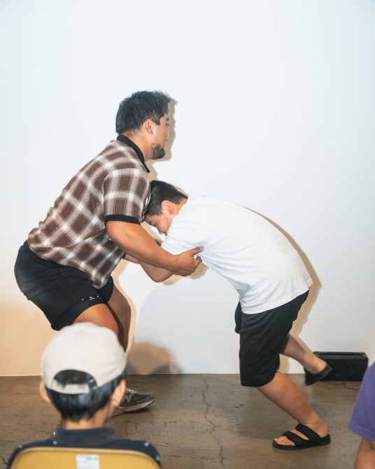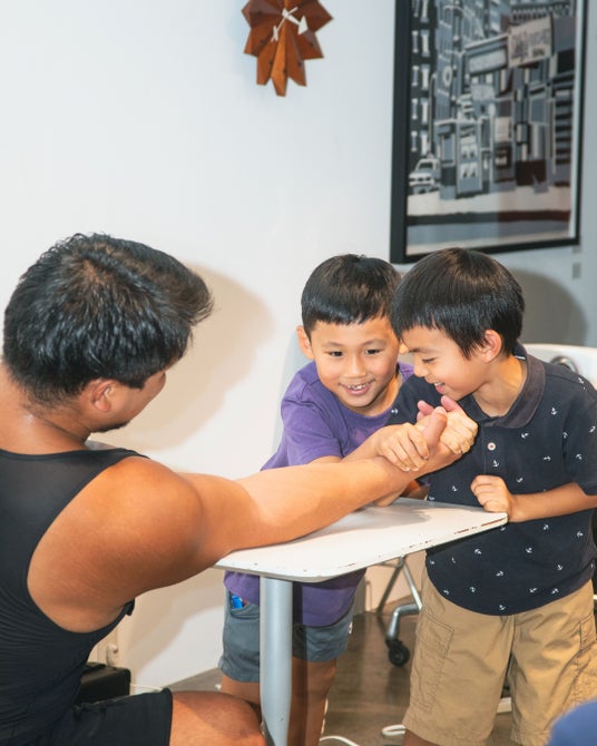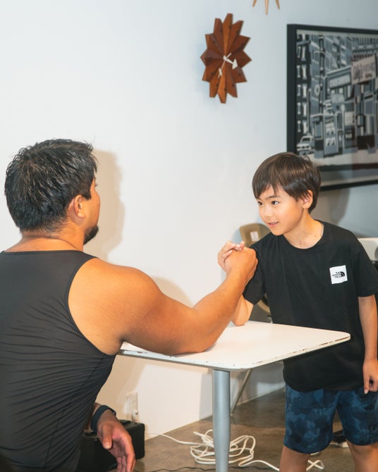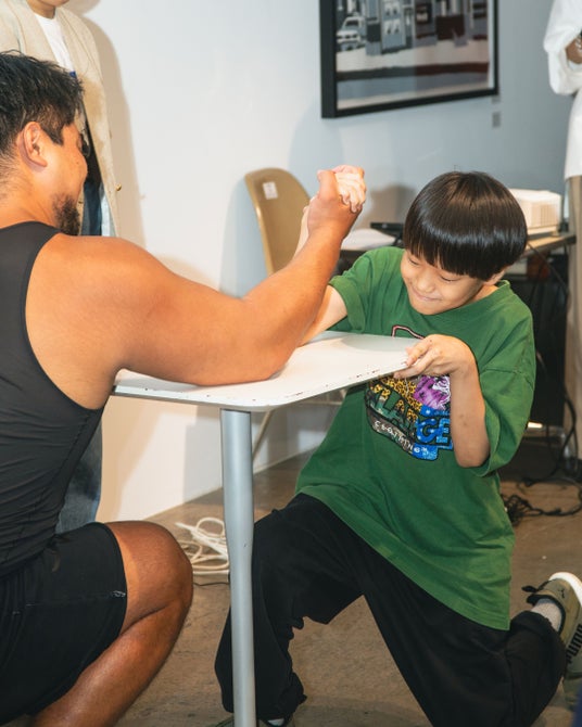 この日一番の盛り上がりを見せたのが、腕相撲大会。花田選手は、「この日のために前日ジムでパンプアップして来ました!」と会場を笑わせました。最初こそ、花田選手の大きさに圧倒されていた参加者たちも、「次こそは倒すぞ」と花田選手に挑んでいました。