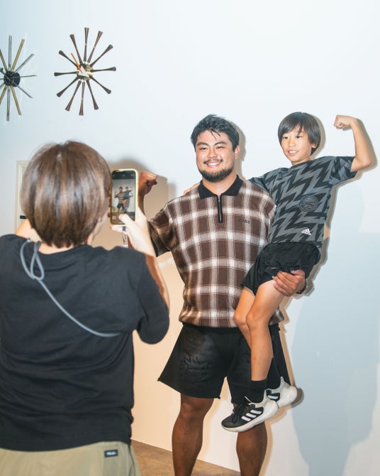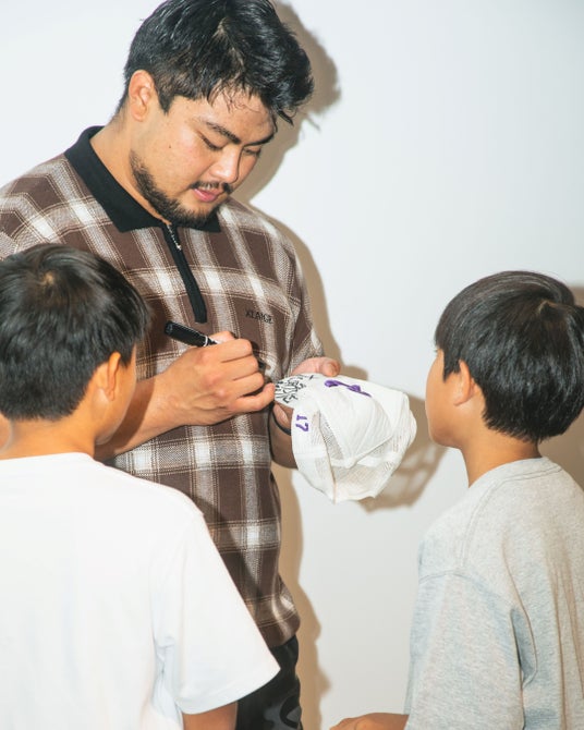 参加者全員での記念撮影のあとは、個別での撮影・サインタイム。軽々と持ち上げて記念撮影や、キャップやTシャツにサインを書いてもらう参加者、「花田選手にぶつかりたい!」というリクエストにも答えました。