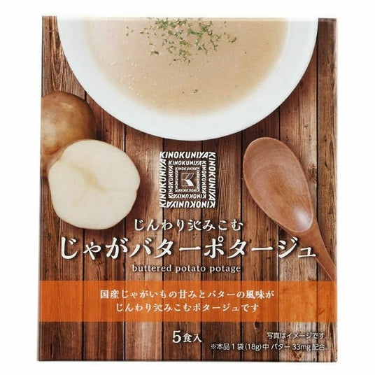 国産じゃがいものやさしいコク - じゃがバターポタージュ国産じゃがいもを使い、バターの風味豊かに仕上げたポタージュです。お湯を注ぐだけで手軽に用意でき、気軽に味わえて心を和ませる一杯。お湯を注ぐだけで簡単に楽しめるポタージュは、普段の食卓だけでなく、アウトドアでも楽しめるので常備しておくと便利な一品です。