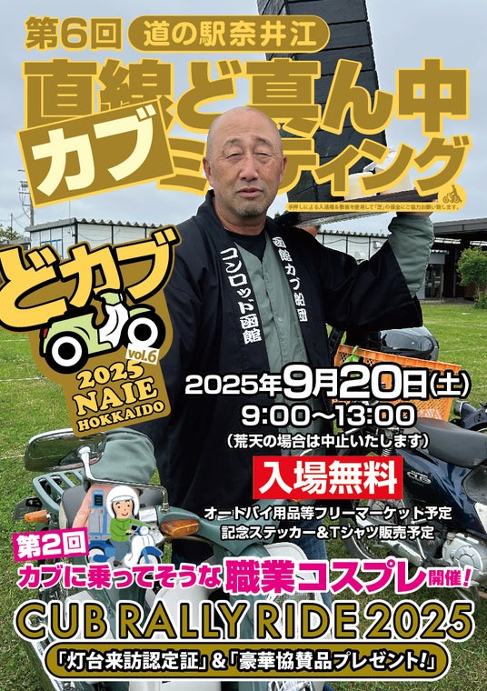 6回目となる、オートバイの「カブ」愛好家が集まる「直線ど真ん中カブミーティング(どカブ)」が、今回も奈井江町の道の駅で開催されます。このイベントは、奈井江町が、29.2kmの日本一の直線道路(国道12号)の中間地点に位置することに由来し、2023年から年2回(6月と9月)に開催されています。前回開催時は約200台のカブが集結しました。【会場】 道の駅ハウスヤルビ奈井江