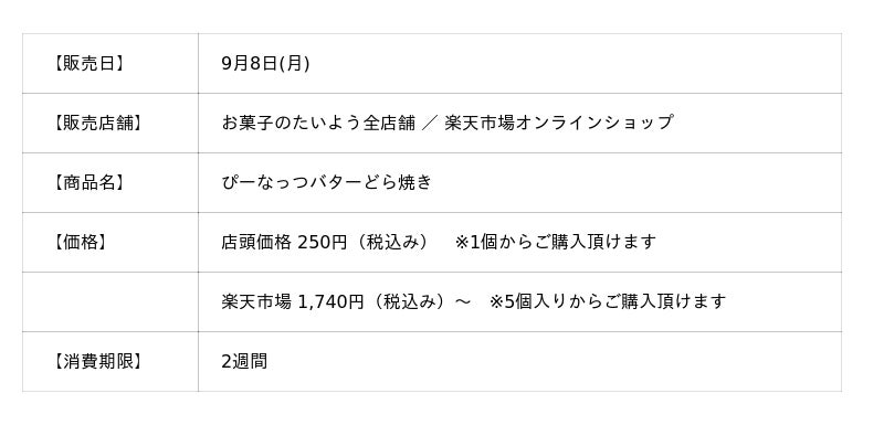 株式会社太陽社(所在地:千葉県匝瑳市飯倉293、代表取締役:片岡正裕)が展開する千葉県で長年愛される菓子店「お菓子のたいよう」は、秋の味覚を贅沢に詰め込んだ大人気商品「ぴーなっつバターどら焼き」を、2025年9月8日(月)より発売いたします。