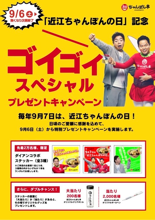 前日の9月6日(土)から、全国の「近江ちゃんぽん亭」全店にて2つの記念施策を同時スタート。限定メニューとコラボキャンペーンにより、お客様に"驚き"と"楽しさ"を提供します。