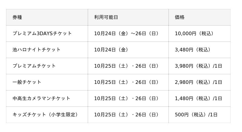 9月5日(金)17時より、「池袋ハロウィンコスプレフェス2025」各種チケットの発売を開始します。池ハロナイトを含む「プレミアム3DAYSチケット」は、荷物置き場の夜間預かりや、受付した翌日以降は並ばずに更衣室、荷物置き場、撮影に直行ができるほか、「プレミアムチケット」の5つの特典が付いています。
