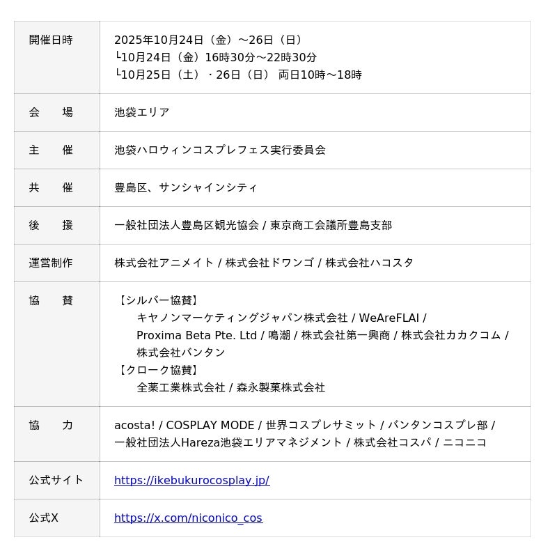 株式会社ドワンゴ、豊島区、株式会社サンシャインシティ、株式会社アニメイト、株式会社ハコスタが参画する池袋ハロウィンコスプレフェス実行委員会は、「池袋ハロウィンコスプレフェス2025」(開催:2025年10月24日~26日)にて実施する企画情報の第1弾を、以下の通りお知らせします。