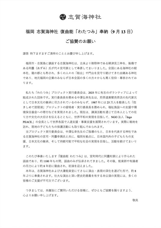 ファーストイノベーション(本社:東京都中央区晴海3-13-1 52F、代表取締役社長:木ノ根雄志)は、官民連携の地方創生団体『一般社団法人つながり応援』(理事長:清水国明、副理事長:木ノ根雄志・梶川隆史)が展開する地方創生活動『つながり応援プロジェクト』の一環として、2025年9月13日・14日に福岡市で開催される復曲能「わたつみ」福岡公演に協賛いたします。