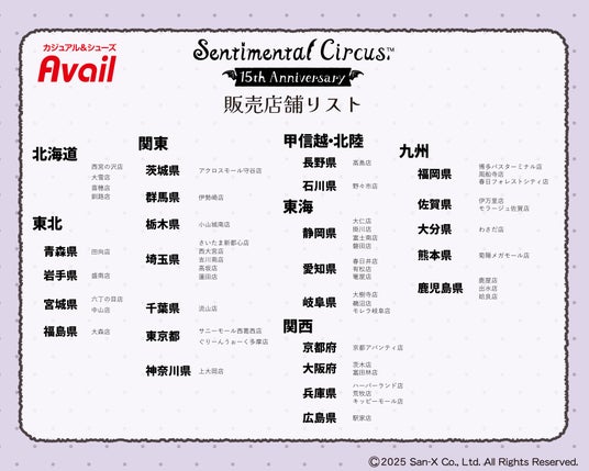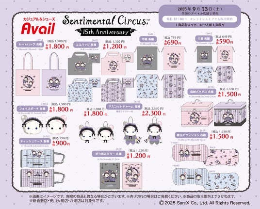 サンエックス株式会社(本社:東京都千代田区)は、センチメンタルサーカスが今年15周年を迎えたことを記念し、しまむらグループのアベイル店舗とオンラインストアにて9月13日(土)よりコラボグッズが発売されることをお知らせします。(オンラインストアでは9月13日(土)12:00より販売開始)