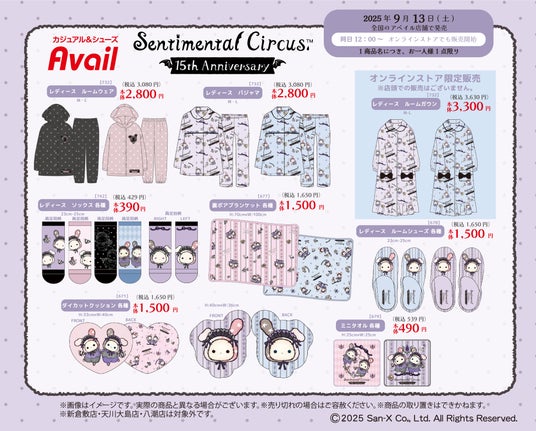 アベイルにてセンチメンタルサーカス15周年企画グッズが発売!ルームウェアやクッションなど幅広いアイテムが全国のアベイル店舗にて9月13日(土)より販売開始