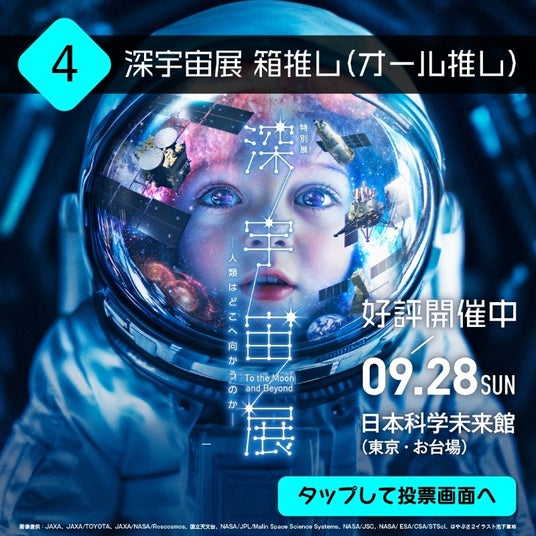 展覧会公式SNS(X: @deep_space_2025)をフォローしていただき、キャンペーンお知らせ投稿の選択肢から、【推しの展示】をタップして投稿することで参加できるXのキャンペーンです。投稿の際は、グッときた、あなたに響いた特別展「深宇宙展」の感想もぜひ教えてください!■実施期間:2025年9月3日(水)~9月12日(金)