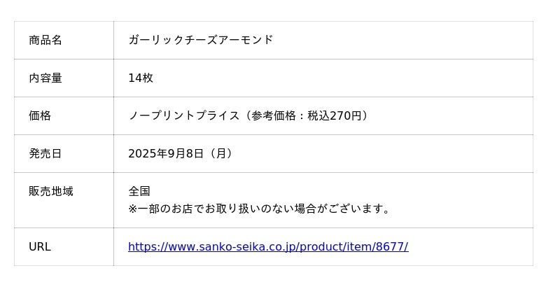 三幸製菓株式会社(所在地:新潟市北区)は、「14枚 ガーリックチーズアーモンド」を2025年9月8日(月)から全国で発売いたします。