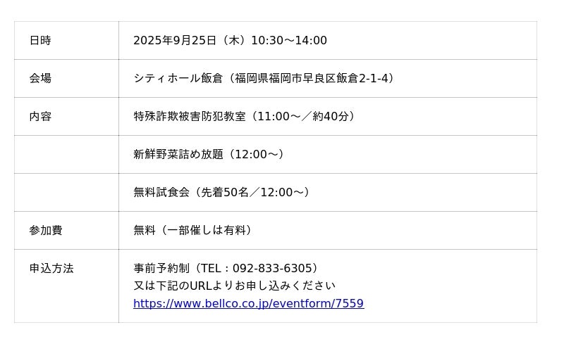 株式会社ベルコ(本社:大阪府池田市)は、地域の皆さまに向けた防犯啓発と交流の場として、2025年9月25日(木)に「シティホール飯倉」(福岡市早良区)にて「特殊詐欺被害防犯教室」を開催いたします。