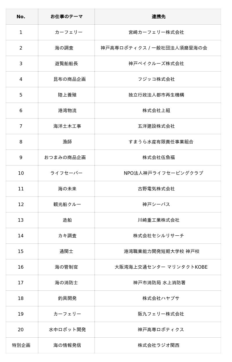 今年は、子どもたちの夏休みシーズンにあわせて7月19日(土)~8月11日(月・祝)の期間を中心に開催し、例年の人気プログラムに加えて新たに『海洋土木工事』『通関士』『フェリー』といった、専門性の高い港湾の職種を追加するなど "海洋都市神戸"ならではの、海のお仕事を発信する取り組みとして、更なる拡充を果たしました。さらに、8月20日(水)には、お仕事体験に参加した子どもたち(3名)がキッズリポーターとしてラジオ関西の番組に生出演する特別企画を実施。今後も地域・産業が一帯となって様々な体験を提供し、子どもたちの健全な成長および神戸市の海洋産業の発展につなげていきます。