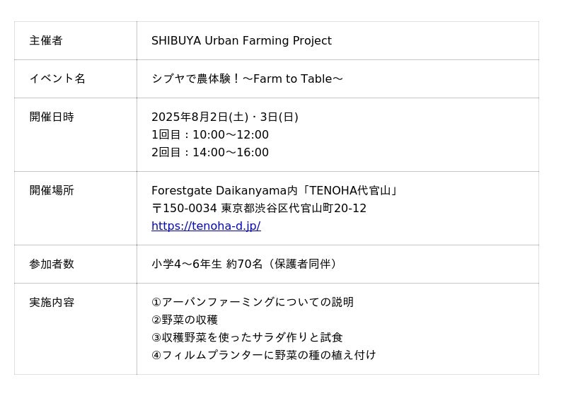 キユーピー株式会社(代表取締役 社長執行役員:高宮 満)と一般社団法人渋谷未来デザイン(代表理事:小泉 秀樹)が主催する「SHIBUYA Urban Farming Project」は小学生を対象とした農体験イベント「シブヤで農体験!~Farm to Table~」を2025年8月2日(土)・3日(日)に東京都渋谷区のForestgate Daikanyama内「TENOHA代官山」にて開催しました。2日間で約70名の小学生とその保護者が参加し、アーバンファーミング(都市農)を体験しました。