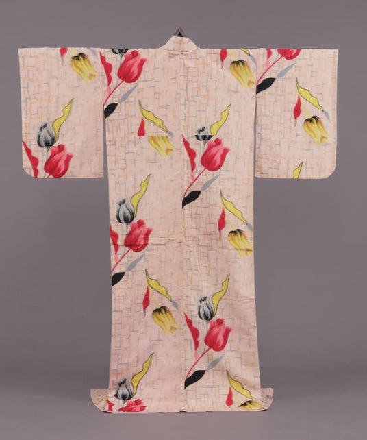 出品作品1.「桃色地煉瓦チューリップ模様銘仙着物 昭和時代・20世紀」