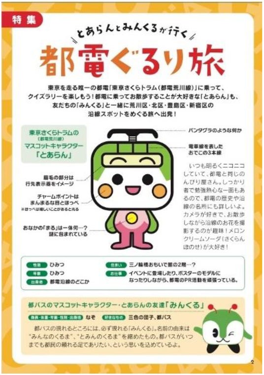 参加者には東京さくらトラム(都電荒川線)マスコットキャラクター「とあらん」をはじめ、沿線4区のキャラクターが登場するクイズ帳を配布します。かわいいキャラクターたちが自身のプロフィールを紹介するとともに、それぞれの区の施設や観光スポットを案内していますので、この秋、東京さくらトラムに乗りながら、沿線4区のクイズラリーを楽しんでみてはいかがでしょうか。