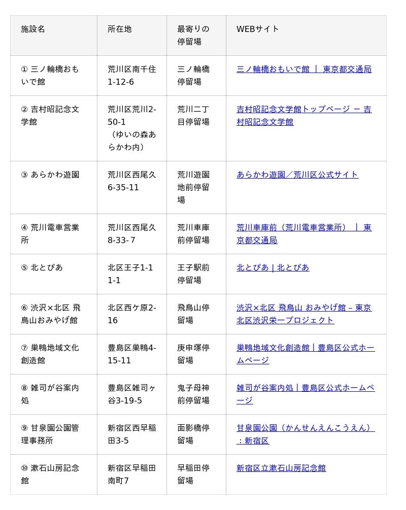 三ノ輪橋おもいで館、吉村昭記念文学館(ゆいの森あらかわ内)、あらかわ遊園、荒川電車営業所、北とぴあ、渋沢×北区 飛鳥山おみやげ館、巣鴨地域文化創造館、雑司が谷案内処、甘泉園公園管理事務所、漱石山房記念館